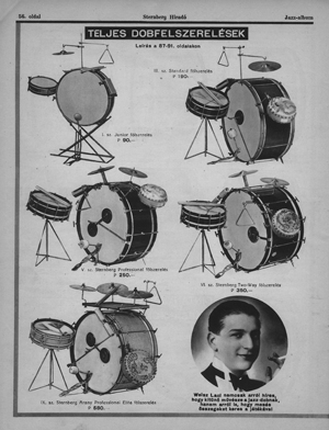 Weisz Api olyan kvalitásos zenész volt már a 30-as években, hogy az amerikai Leedy gyár budapesti reklámemberének fogadta. Minden évben kapott egy komplett dobfelszerelést, hogy hagyja magát lefényképeztetni a hangszerrel. A szereléssel járt egy olyan fonott kosár, mint egy strand-koffer. Megvolt a helye benne a doboknak, a cintányéroknak, a fedelében kis fiók a cájgoknak, a pedálok egy kengyelbe illettek bele. A ládát két lakattal lehetett lezárni vasúti feladáshoz, mert a zenészek akkoriban így utaztak. Ezeket a hangszereket ő időnként el is adta, amiből többen is vásároltak. Azt tudom, hogy az Arany Árpi nevű dobosnak is volt Leedy dobja, én is vásároltam egy hófehér Weisz Api dobot. Apám azt mondta, annyiért Sashalmon vehettem volna egy kis családi házat.