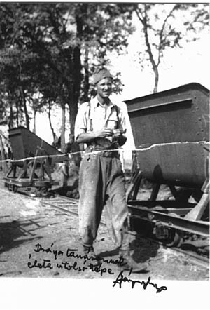 - A pilisvörösvári táborban látogattam meg Apit, és lopva vittem neki ebédet. Ahogy elbúcsúztunk, és az őr nem figyelt, a kerítéstől lefényképeztem, amint egy csille mellett áll, amiben német tiszti egyenruhákat tol a mosodába.