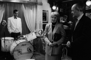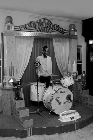 A jelvényt a kor leghíresebb amerikai jazzdobosa, Gene Krupa tűzte Api hajtókájára, amikor 1936-ban Londonban találkoztak. Elképzeltem egy eredeti dobfelszerelést is, mögötte életnagyságú fotóval. Szerettem volna, ha a látogatók úgy érzik, mintha hősünk a két oszlop között most lépett volna be a Moulin Rouge színpadára, majd egy pillanatra megáll, üdvözli zenésztársait és a közönséget, és elfoglalja helyét a dob mögött. Az installáció tervezése nagyszerű kihívás volt, hiszen a kor jellemző építészeti és díszítő stílusa az általam is kedvelt art deco volt.